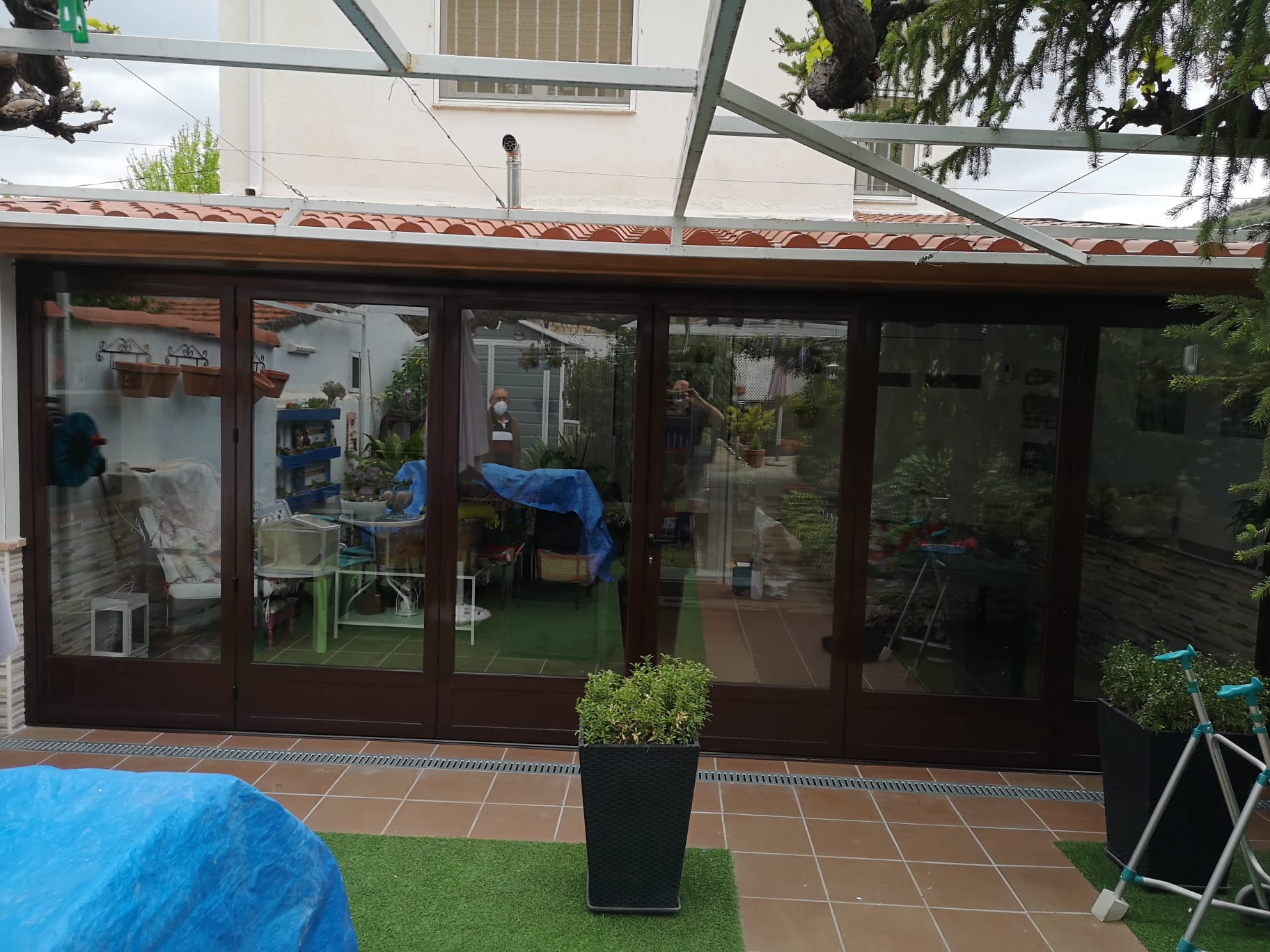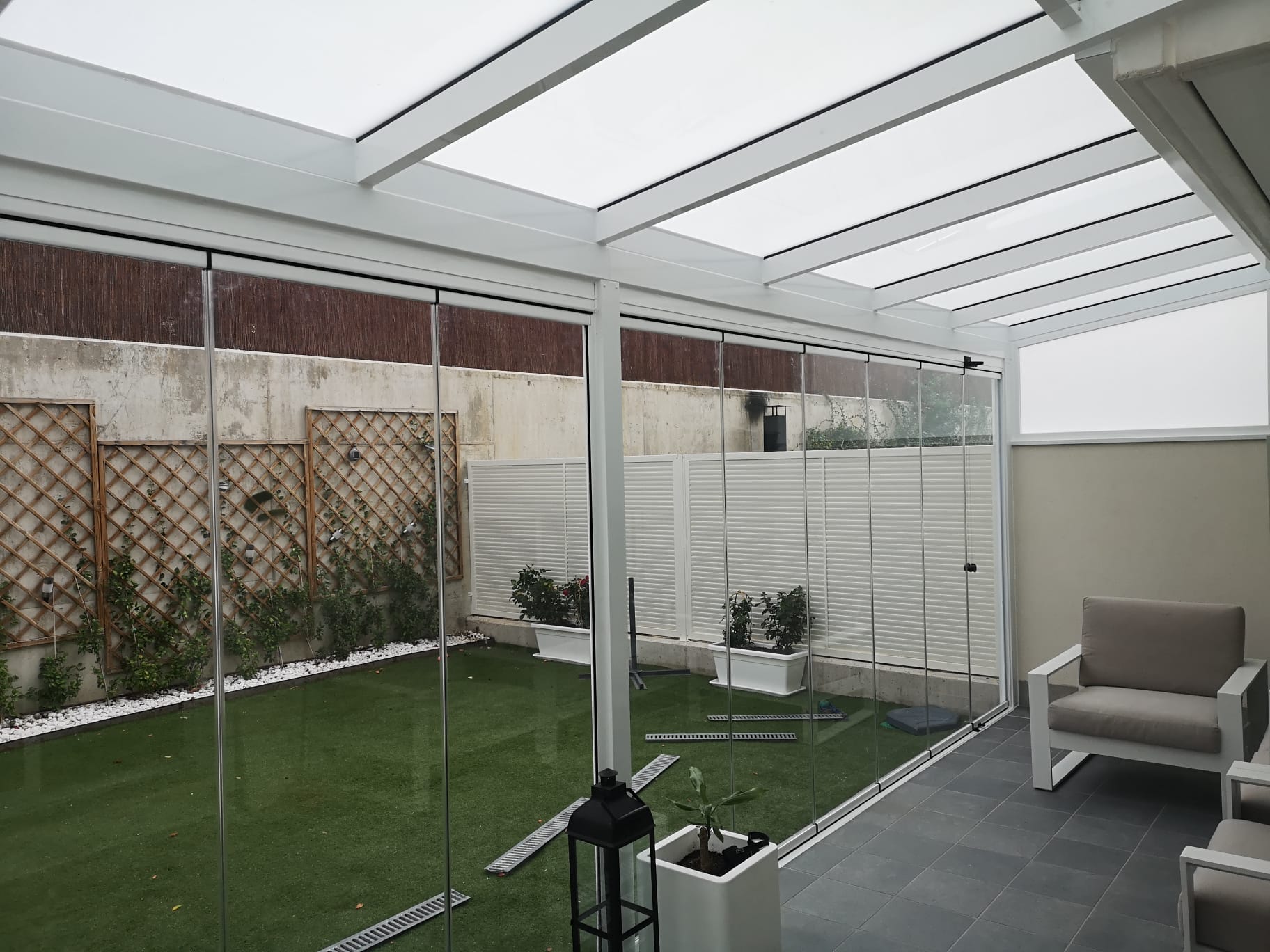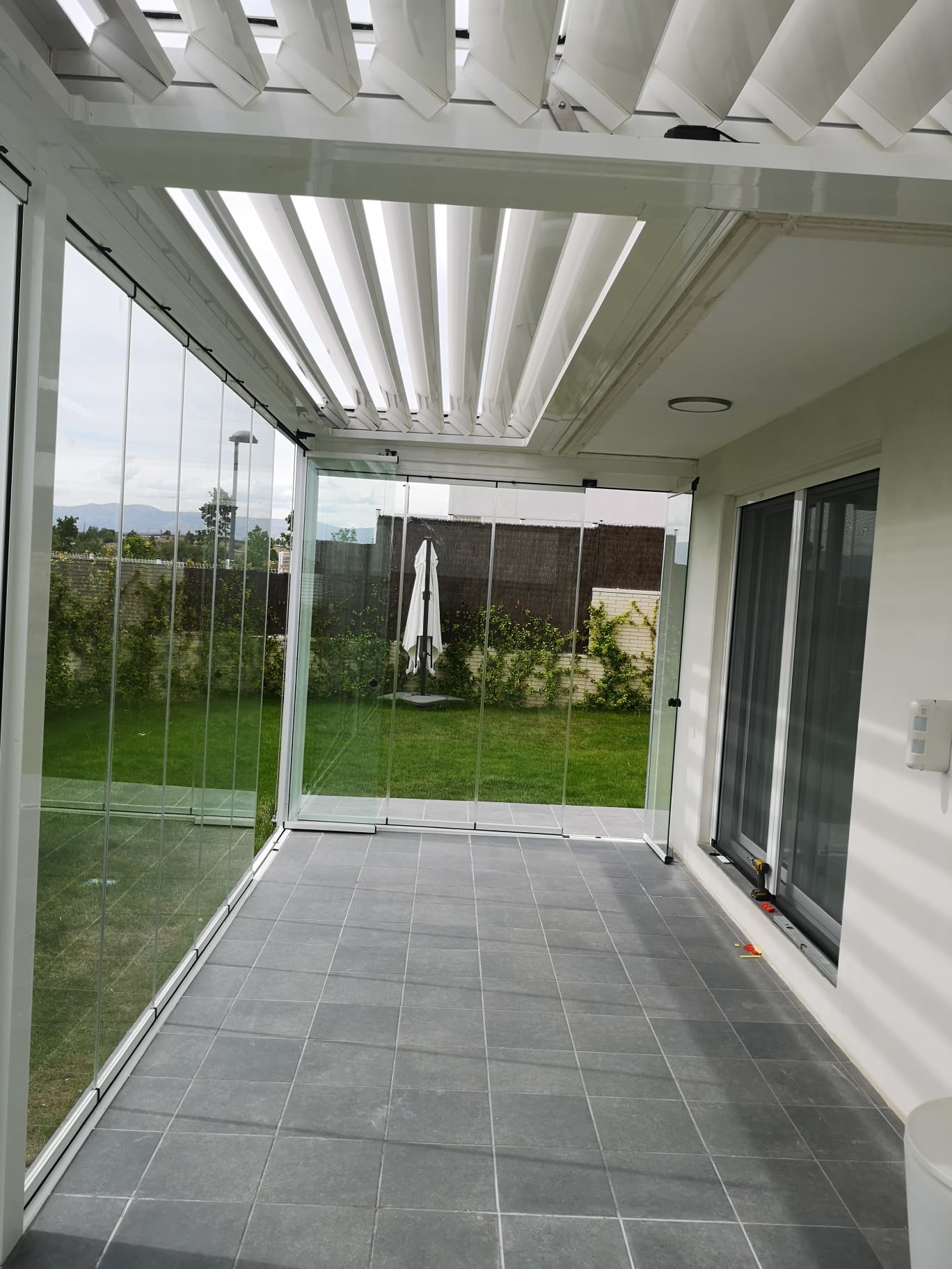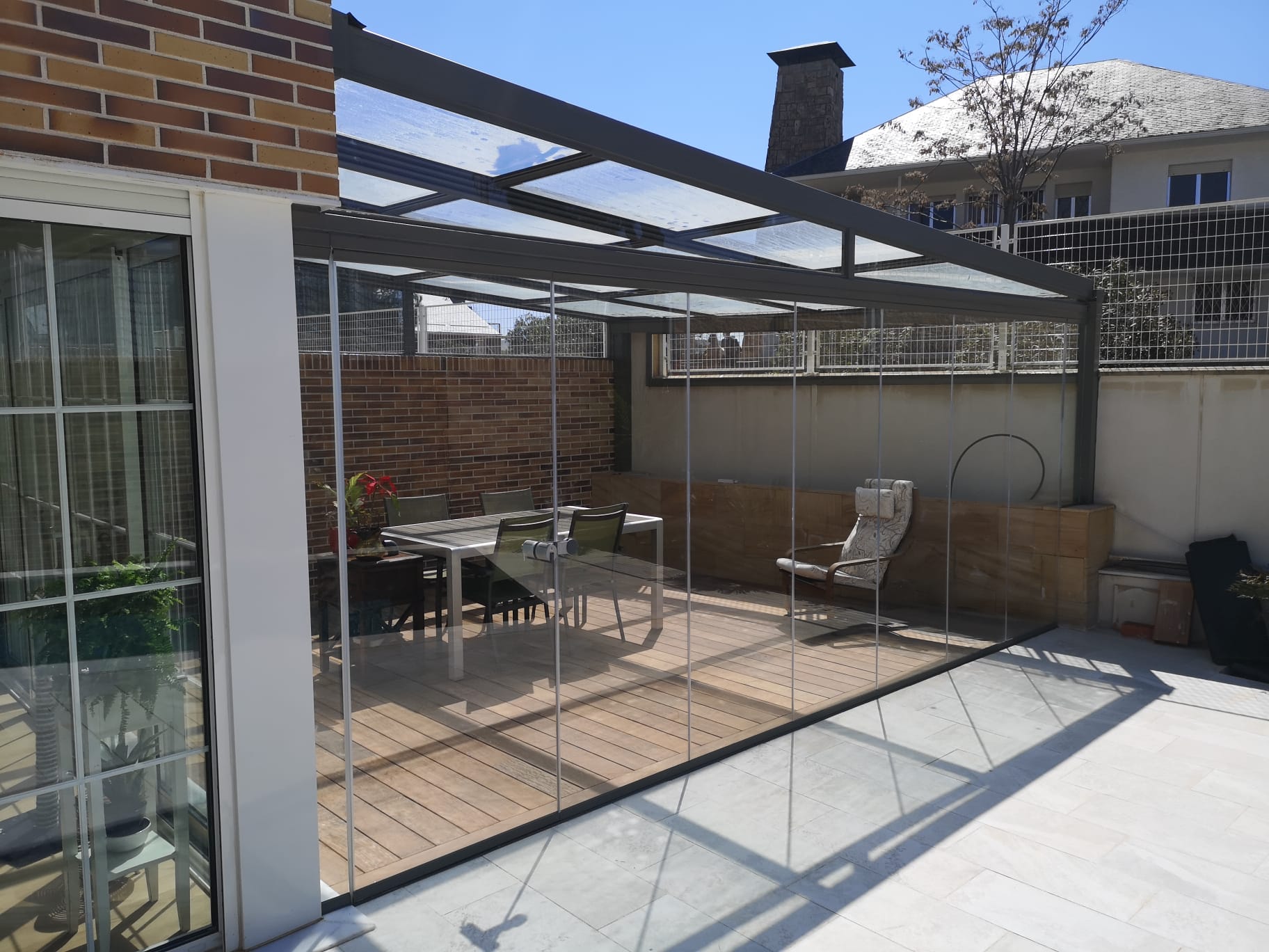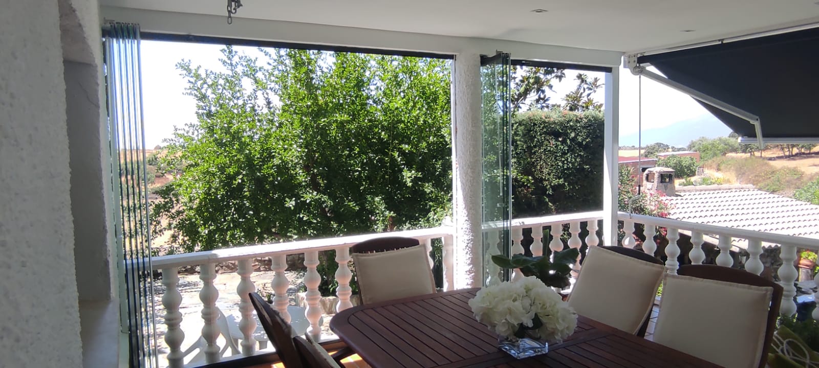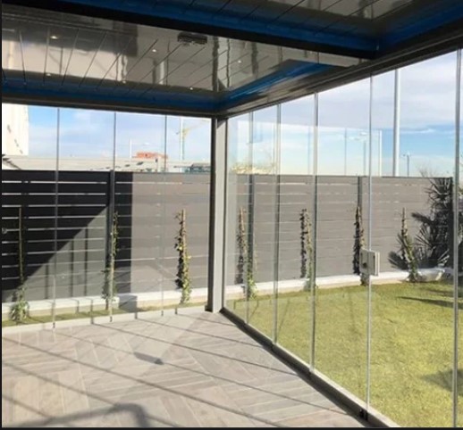 Cuando haga buen tiempo y quieras tenerlo abierto, repliegas las cortinas de cristal hacia un lado, y queda todo el espacio franco para que corra el aire libre.